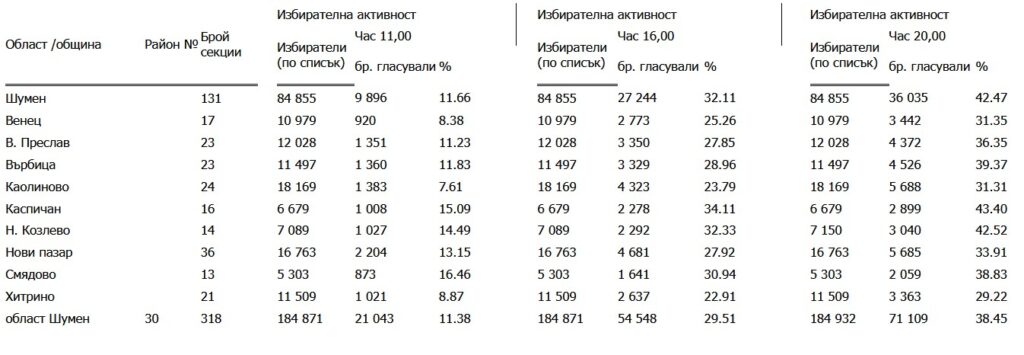 Изборният ден в област Шумен приключи. Към 20:00 часа своят глас са дали 71 109 души или 38.45%. Най-много избиратели са участвали във вота в община Каспичан – 43.4 на сто или 2899 души.