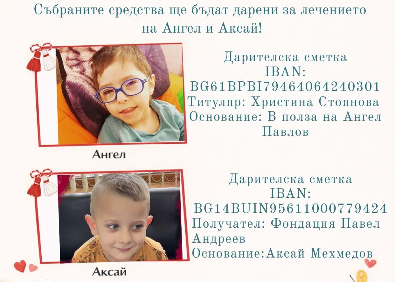 Събраните средства ще бъдат дарени за лечението на 7-годишния Ангел от Шумен и 6-годишния Аксай от Търговище.