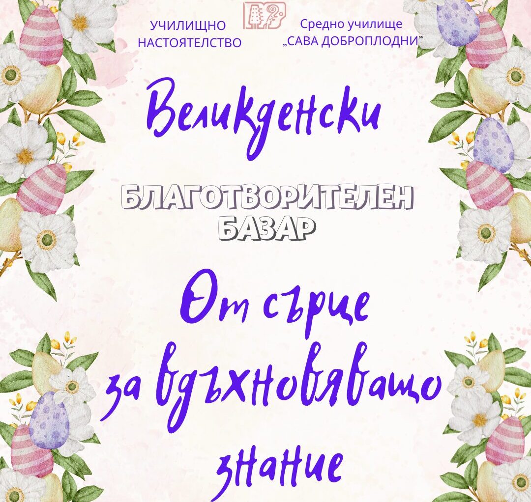 По инициатива на Училищното настоятелство, от 17:30 ч. днес в двора на СУ „Сава Доброплодни“ ще се проведе благотворителен великденски базар под мотото „От сърце за вдъхновяващо знание“. Традиционно събитието е изпълнено с настроение, креативност и много усмивки – истински празник на добротворството и общностния дух, съобщават от училището.