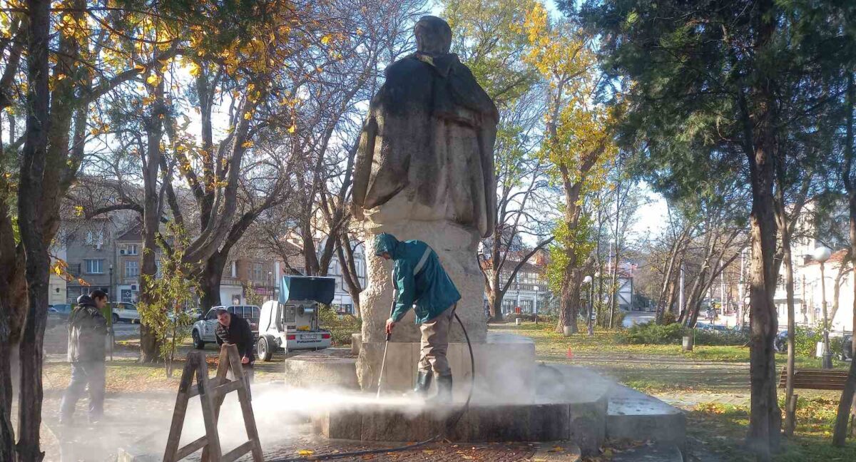 Почистване от замърсяване и нанесени графити по повърхността на паметници и други публични обекти в града започна Община Шумен.