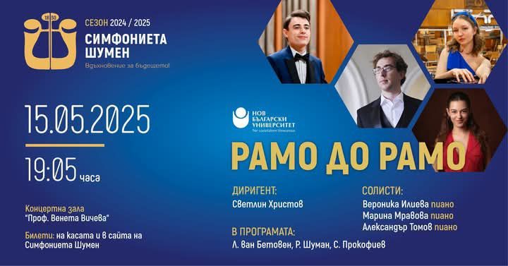 Изгряващи звезди на класическата музика ще концертират заедно със Симфониета – Шумен под диригентството на Светлин Христов. На 15 май, от 19:05 ч., в зала „Проф. Венета Вичева“ в концерта под наслов: „Рамо до рамо“ ще прозвучат три от най-емблематичните концерти: Концерт №5 за пиано и оркестър („Императорски“) от Лудвиг ван Бетовен, Концерт №1 за пиано и оркестър от Сергей Прокофиев и Концерт в ла минор за пиано и оркестър от Роберт Шуман. Солисти на вечерта са младите музикални дарования Вероника Илиева, Марина Мравова и Александър Томов.