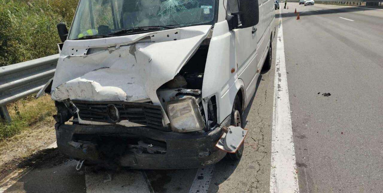 По първоначални данни водачът на буса предприел изпреварване на лекия автомобил, бил застигнат от друга кола. Връщайки се в лентата, ударил автомобила.