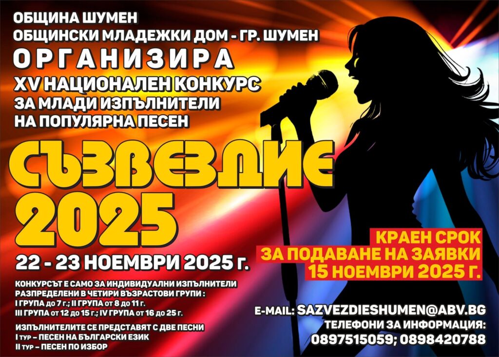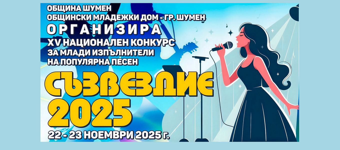 С петнадесетото си издание Националният конкурс за млади изпълнители на популярна песен „Съзвездие“ 2025 отново ще събере на 22 и 23 ноември 2025 година в Общински младежки дом в Шумен най-талантливите млади гласове от цялата страна. Форумът, превърнал се в традиция и престижна сцена за изява на бъдещи звезди, ще даде възможност на участниците да покажат своя талант, артистичност и любов към българската и световната популярна музика. Конкурсът предоставя възможност на участниците не само да покажат своя вокален и сценичен потенциал, но и да се срещнат с професионалисти от музикалните среди, жури и публика, които ще оценят техния талант и развитие. Националният конкурс за млади изпълнители се организира от Общински младежки дом – Шумен, с финансовата подкрепа на Община Шумен.
