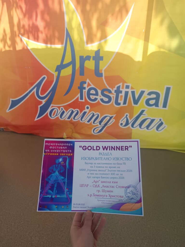 - Диплом „GOLD WINNER“ – най-голямото отличие и единствено в раздел „Изобразително изкуство“, както и Плакет „Утринна звезда“ на Арт школата към ЦПЛР-ОДК „Анастас Стоянов“ – Шумен. Наградата включва ваучери за участие в Арт лагер в гр. Банско и МФИ „Утринна звезда“ през 2026г.