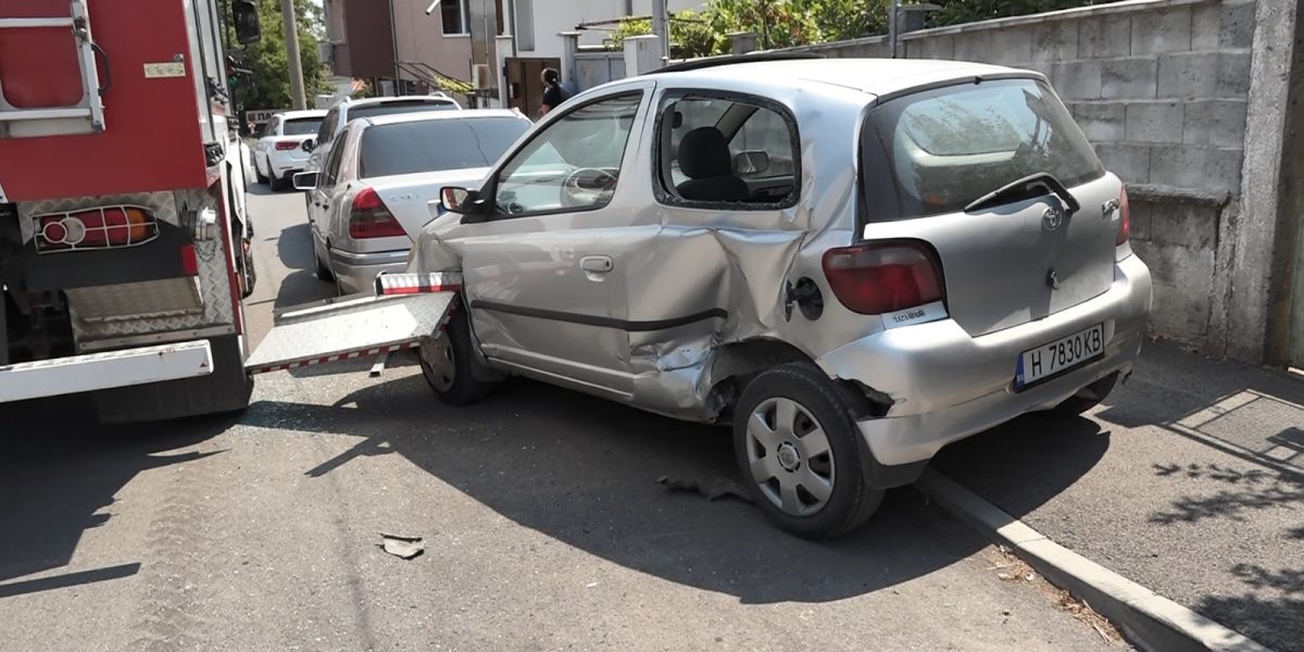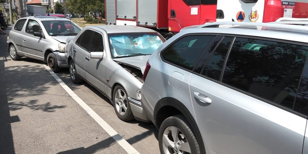 По време на движение се отваря дясната степенка в страничната задна част на пожарния автомобил и закача паркирана кола, която удря друга пред нея.