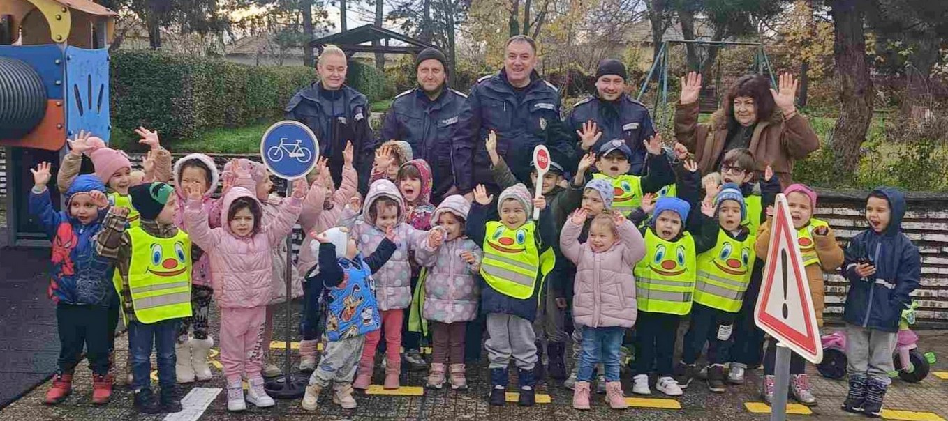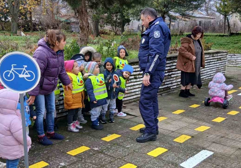 На изградената площадка за пътна безопасност в двора на детското заведение, децата, с помощта на полицейските инспектори Милен Минев и Илия Илиев, научиха основни правила за движение – да пресичат само на пешеходна пътека, да спазват на светлинните сигнали на светофара, внимателно да се оглеждат преди пресичане и на тази възраст да не пресичат сами, а придружени от мама, татко или друг възрастен.