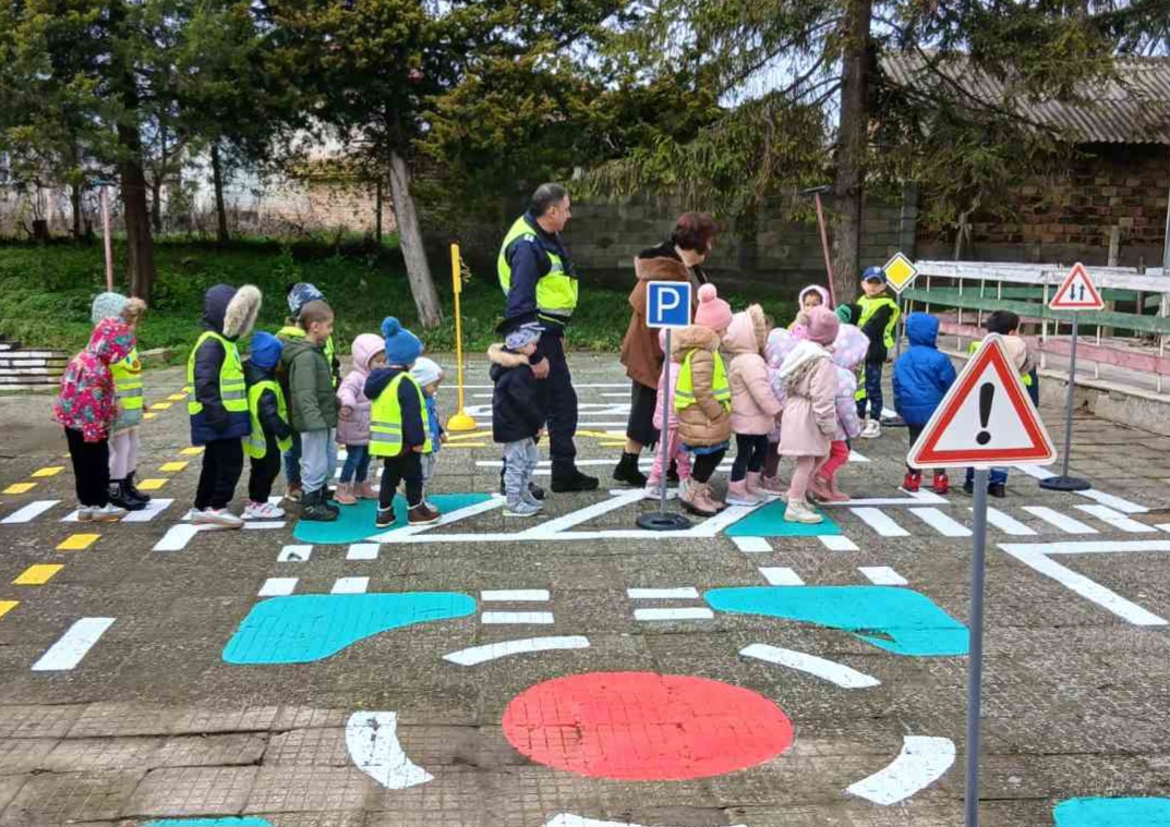 Децата участваха в практическо занимание, в което под формата на игра, заедно с полицейските служители Наталия Георгиева и Цанко Колев, пресъздадоха реални ситуации от пътното движение. С помощта на пътни знаци, светофар и пешеходни пътеки се научиха как да пресичат безопасно и правилно. Напомнено им беше, че е добре да имат светлоотразителни елементи по облеклото , за да могат водачите да ги виждат добре на пътя. Униформените им обърнаха внимание да играят далече от пътното платно и да не излизат внезапно на пътя при игра.
