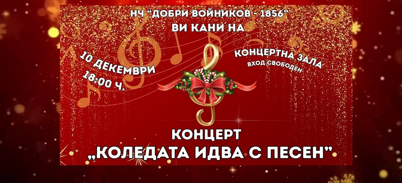 В навечерието на Рождество Христово Народно читалище „Добри Войников – 1856“ организира празничен концерт под мотото „Коледата идва с песен“. На 10 декември (сряда) от 18:00 часа на сцената в концертната зала на читалището ще излязат Смесен хор „Родни звуци“ с диригент проф. д-р Николай Андриянов и корепетитор Ваня Джамбазова и Вокална група „Малка серенада“ с ръководител Димитър Петков.