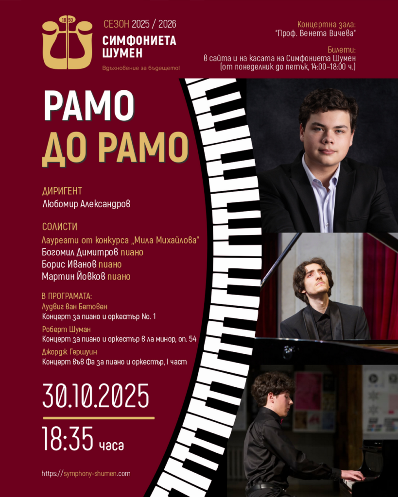 На 30 октомври 2025 г. от 18:35 ч. в зала „Проф. Венета Вичева“, Симфониета – Шумен ще представи концерт под надслов „Рамо до рамо“, посветен на младите таланти – лауреати на Националния клавирен конкурс „Мила Михайлова“. Под диригентството на Любомир Александров, публиката ще има възможност да чуе трима изключителни млади пианисти – Богомил Димитров, Борис Иванов и Мартин Йовков, които ще изпълнят три от най-обичаните концерти за пиано и оркестър от Бетовен, Шуман и Гершуин. Билети за концерта могат да бъдат закупени на сайта и на касата на Симфониета – Шумен.