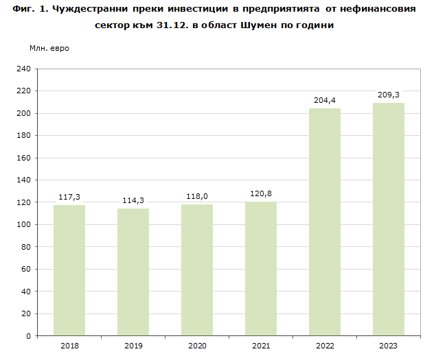 С близо 2.5 процента са се увеличили преките чуждестранни инвестиции в област Шумен на годишна база, сочат данните на статистиката. Към края на 2023 година в нефинансовия сектор са привлечени 209.3 милиона евро. В потока на преките вложения на чуждестранни инвеститори с най-голям дял е промишлеността, където са привлечени малко над 188 милиона евро. На следващо място е секторът на услугите с 5.3 млн. евро.