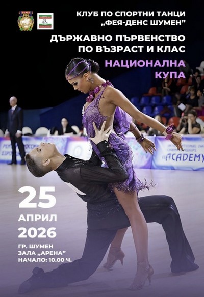 Над 250 участници ще се включат в националното състезание по спортни танци, което ще се проведе в събота, 25 април, в зала „Арена Шумен“. Надпреварата е в пет направления – Държавно първенство по възраст и клас за състезателни двойки и соло момичета, Държавно първенство „Млади надежди“, Купа „Фея Денс“, Купа „Шумен“ и Национална купа III кръг.