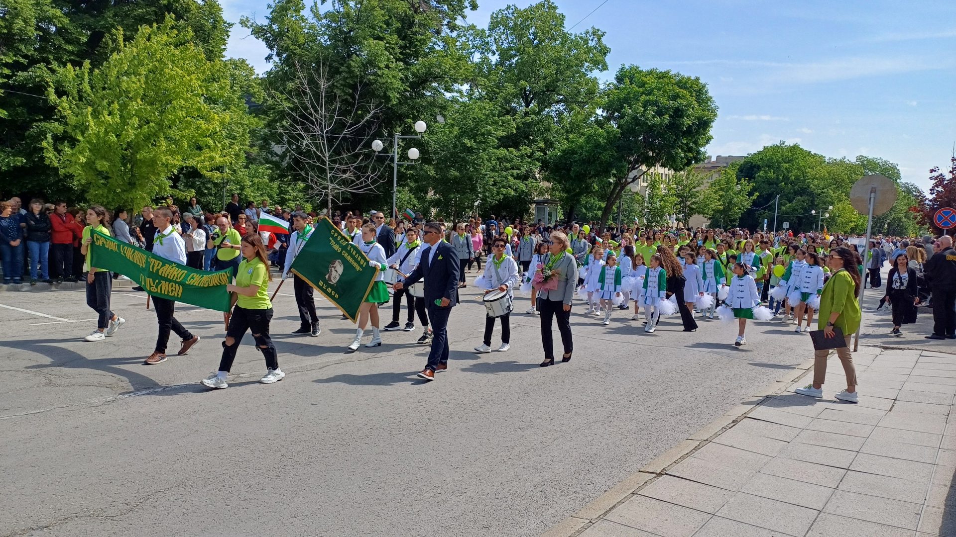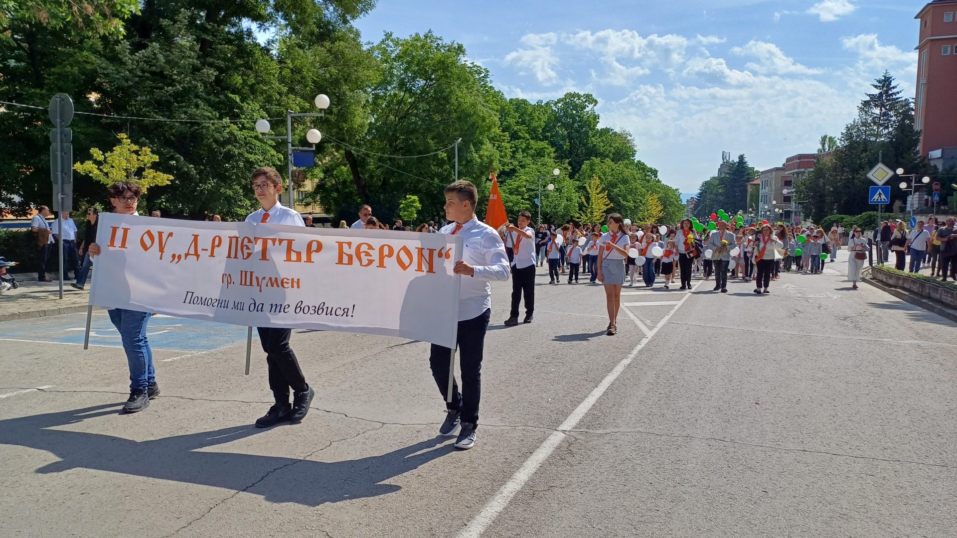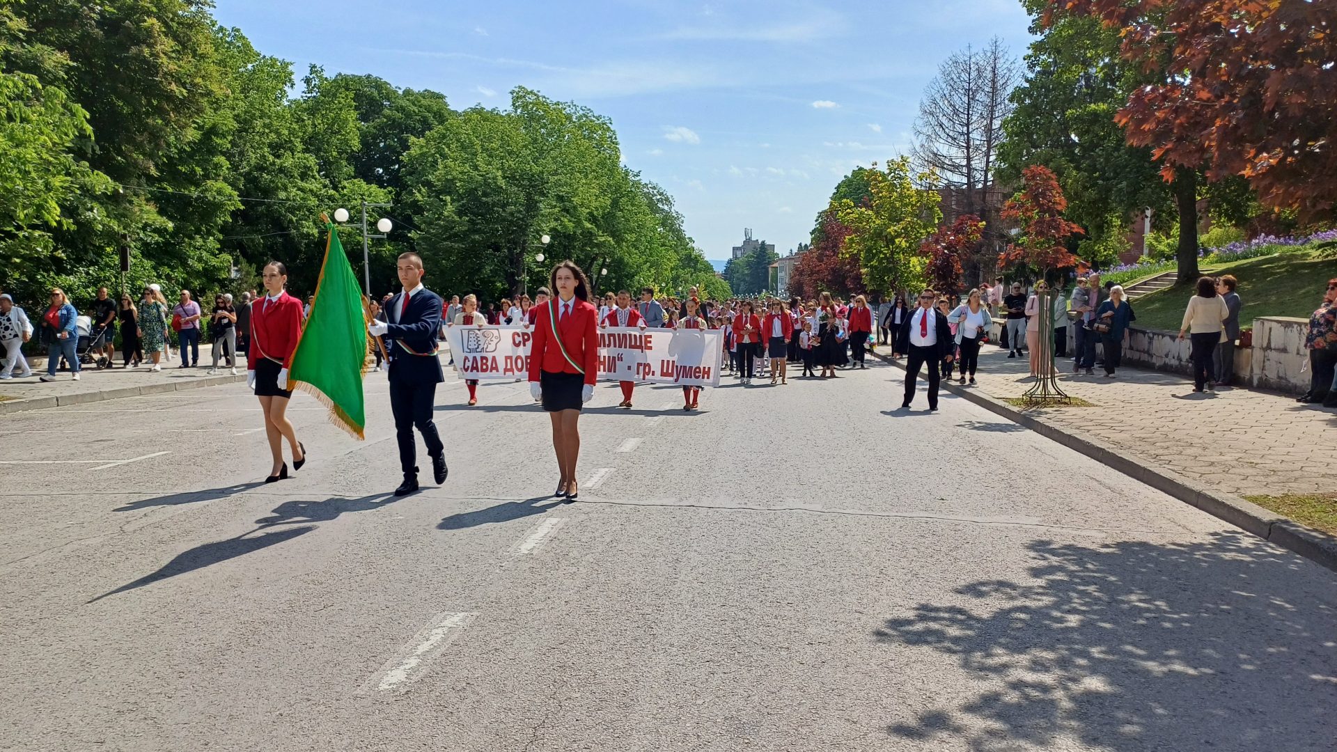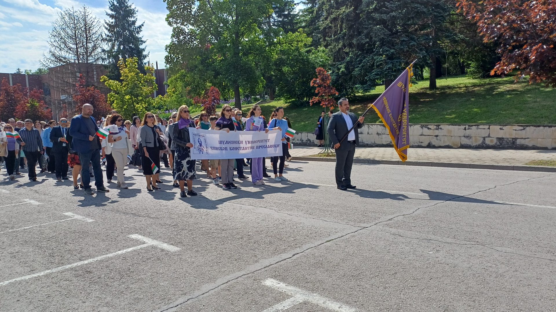 Деца от детските градини, ученици, учители, студенти и преподаватели от Шуменския университет „Епископ Константин Преславски“, от Филиал Шумен на Медицинския университет във Варна, от Факултет „Артилерия, ПВО и КИС“, творчески формации, спортни школи, културно-просветни институции, звена за извънкласна дейност и граждани преминаха в празничните блокове по централния булевард „Славянски“ от площад „Кристал“ до сградата на Община Шумен.