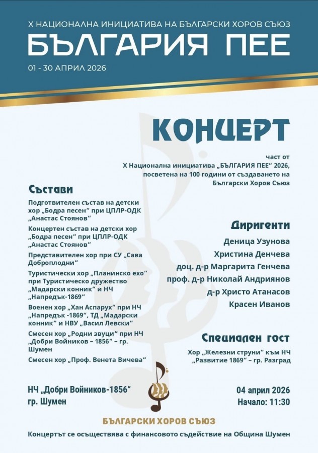 Шумен се включва в националната инициатива „България пее“, която тази година е посветена на 100-годишнината от създаването на Българския хоров съюз. В събота, 4 април, от 11:30 ч. в Народно читалище „Добри Войников-1856“, хорови формации ще изнесат концерт, съобщиха от пресцентъра на Община Шумен. Специален гост ще бъде хор „Железни струни“ към НЧ „Развитие 1869“ – Разград.