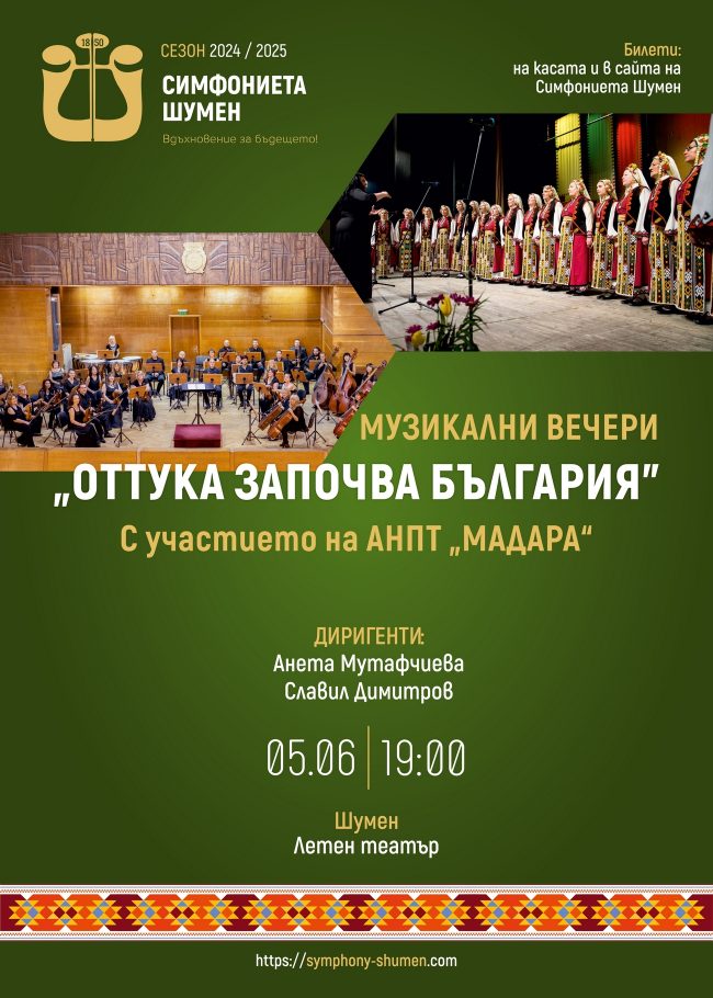 Симфониета – Шумен открива месец юни с поредица от вдъхновяващи концерти под надслов „Музикални вечери – Оттука започва България“. Събитията са посветени на българската музика, на живите традиции и на културната памет на народа ни.