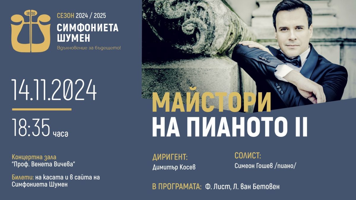 Симфониета – Шумен ще представи втория концерт от цикъла „Майстори на пианото“ на 14 ноември от 18:35 ч. в зала „Проф. Венета Вичева“, с изпълнение на Концерт за пиано и оркестър No. 1 от Ференц Лист и Симфония No.7 от Лудвиг ван Бетовен.