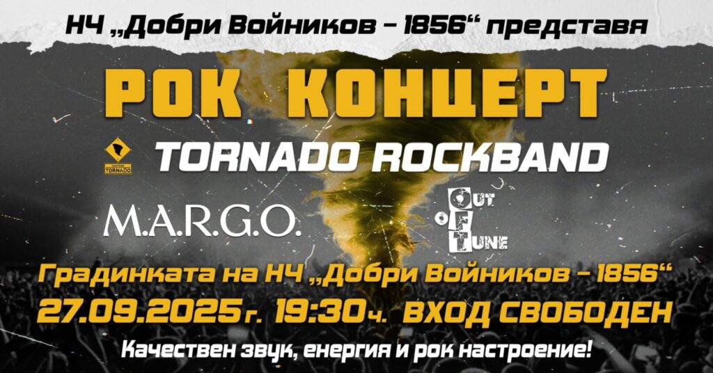 Една от най-популярните и харесвани български рок групи „Торнадо“ ще завладее шуменската публика с мощната енергия на своята музика на 27 септември от 19:30 часа. Концертът ще се състои на открито в градинката пред НЧ „Добри Войников – 1856“. Музикантите гостуват в Шумен по покана на читалището за участие в съпътстващата програма на Международния фестивал на популярната песен „Есенни шуменски вечери“.