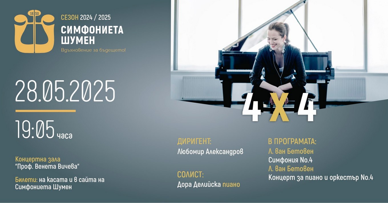 Вдъхновяваща програма, посветена на Лудвиг ван Бетовен, ще поднесе на ценителите на класиката Симфониета – Шумен в концертната вечер на 28 май. Музикалното събитие „4 x 4“ – Бетовен, с участието на Дора Делийска, е част от концертния сезон 2024/2025 на Симфониета – Шумен и символизира силата на четвъртите творби на великия композитор.