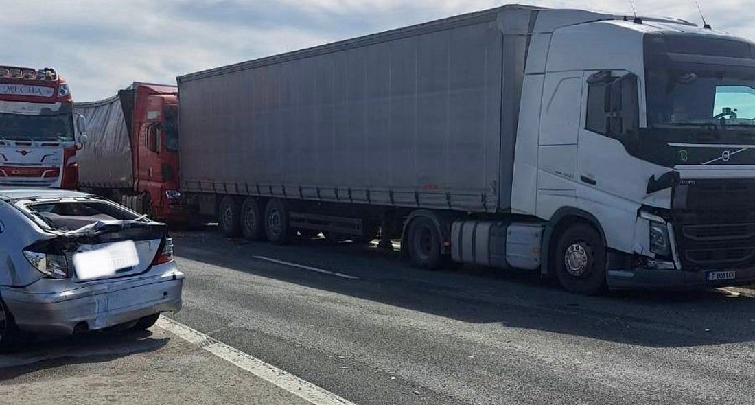 Жена, която била зад волана на лек автомобил с варненска регистрация се движила в ускорителната лента на магистралата. Спряла рязко, като движещите се зад нея водачи на два тежкотоварни автомобила не успели да спрат навреме. В задната част на лекия автомобил се ударил първо водач на камион, а в него се ударил тежкотоварен автомобил с украинска регистрация. За преглед в болницата е откарана жената,която управлявала лекия автомобил. Контактна е.