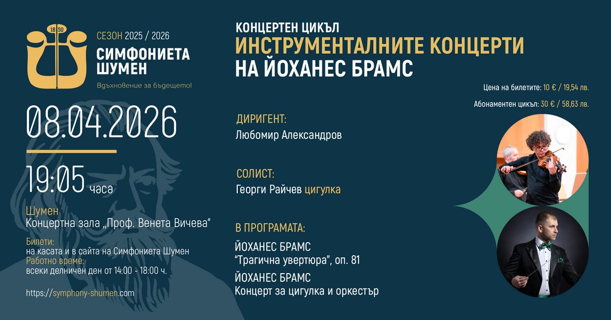 Втори концерт от цикъла „Инструменталните концерти на Йоханес Брамс“ представя през публика на 8 април Симфониета – Шумен. След успешното начало през януари, този концерт продължава линията с фокус върху едно от най-значимите произведения за цигулка в класическия репертоар. На диригентския пулт ще застане Любомир Александров, а солист е цигуларят Георги Райчев.