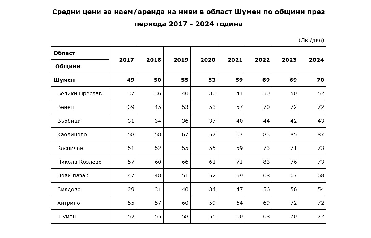 Ръст на цената на декар ниви в Шуменско през 2024 г. отчита статистиката. Скокът е от 2.8 на сто спрямо предходната година. Средната цена на един декар ниви в областта е 1 311 лв., с 22.7% по-ниска от тази в страната.