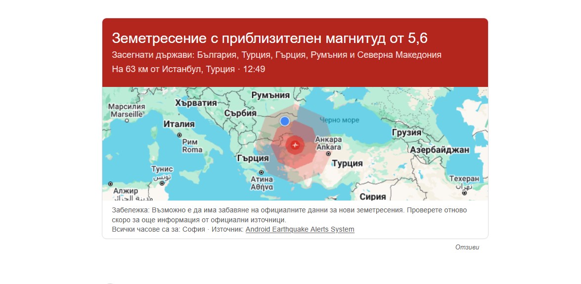Земетресение с приблизителен магнитут от 5.6 по Рихтер в Турция. Епицентърът на труса е регистриран на 63 километра от Истанбул в 12:49 българско време. Земетресението е усетено и в България, Гърция, Румъния и Северна Македония.