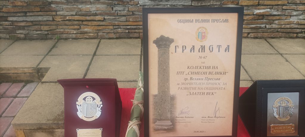 В празничния 24 май кметът на Велики Преслав връчи отличието „Златен век” за значителен принос в развитието на общината на колектива на Професионална техническа гимназия „Симеон Велики“.
