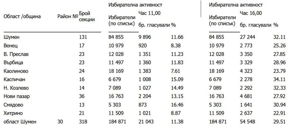 В Община Шумен избирателната активност е по-висока от средната за областта. 27 244 жители са отишли до урните, или 32.11% на сто от имащите право на глас.