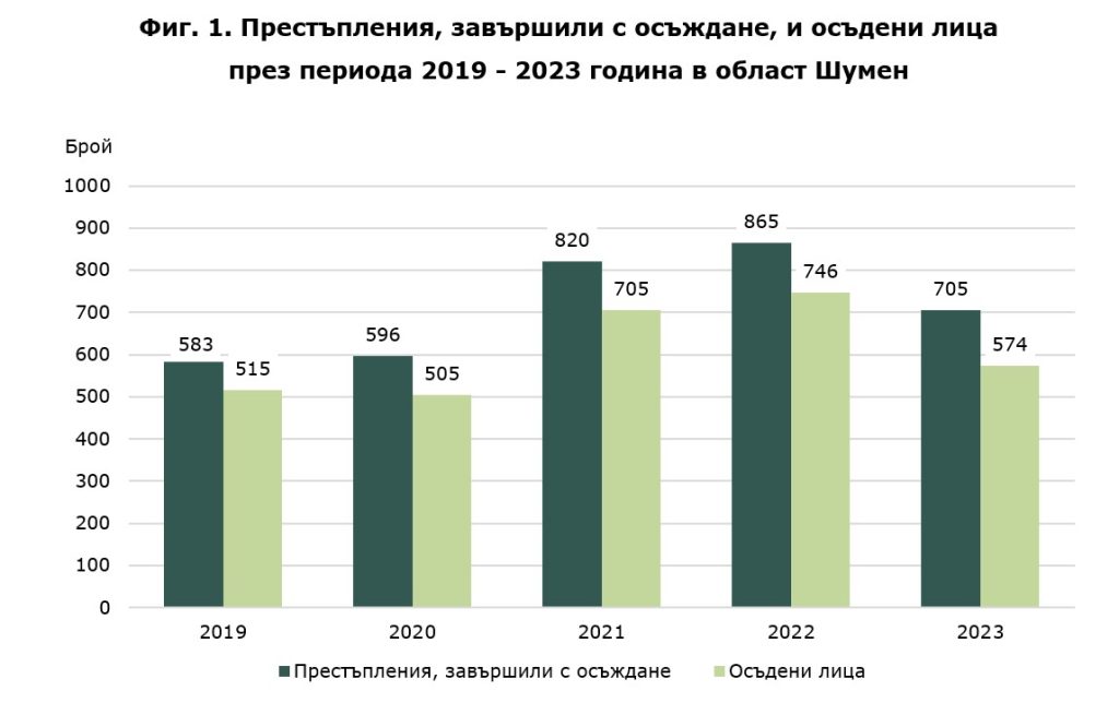 Броят на осъдените лица с влезли в сила присъди през 2023 г. е 574. От тях 454 лица са осъдени за извършването на едно престъпление, 98 – за две престъпления, а 22 – за три и повече престъпления.