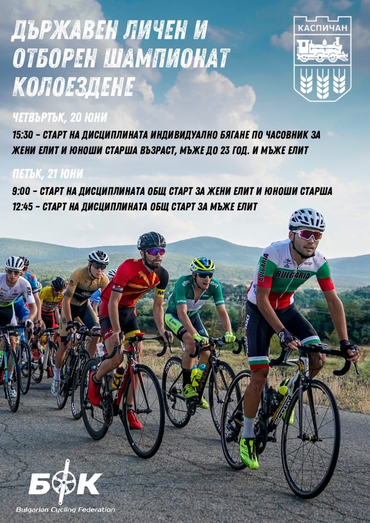 За първи път Община Каспичан ще бъде домакин на Държавния личен и отборен шампионат по шосейното колоездене. Надпреварата стартира на 20 юни, четвъртък, и ще се проведе в два дни. За шампионската титлата в отделните категории ще се състезават най-добрите български колоездачи. Към момента заявки са подали 21 отбора. От 13:30 часа в четвъртък отборите ще бъдат представени официално на церемония по откриването на състезанието на централния площад в гр. Каспичан. Първият старт е от 15:30 ч. на 20 юни в дисциплината Индивидуално бягане по часовник за жени „Елит“ и юноши-старша възраст, като дистанцията е 17 километра. По 34-километровото трасе ще стартират в същия ден мъжете до 23 години и мъже „Елит“. В петък, 21 юни, шампионатът продължава от 9:00 ч. с дисциплината Общ старт, като дистанциите са три: 74 километра за жените, 111 километра – за юноши-старша възраст и 155 километра – за майсторите на колоезденето при мъжете.