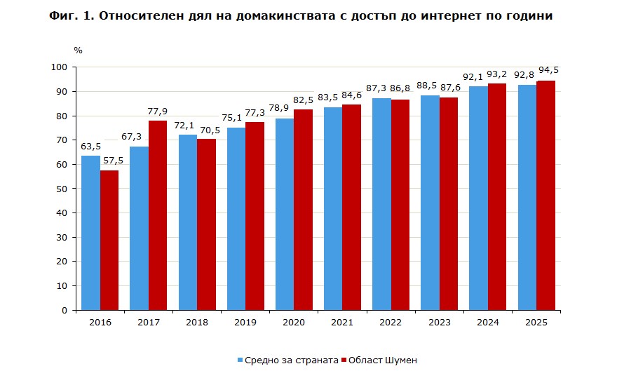 Резултатите от проведеното статистическо изследване за използването на информационни и комуникационни технологии показват, че през 2025 година 94.5% от домакинствата в област Шумен, при 92.8% средно за страната, имат достъп до интернет в домовете си. Запазва се тенденцията на ежегодно нарастване на домакинствата с достъп до интернет, като на годишна база ръстът е 1.3 процентни пункта, а за десетгодишен период увеличението е с 37 процентни пункта.