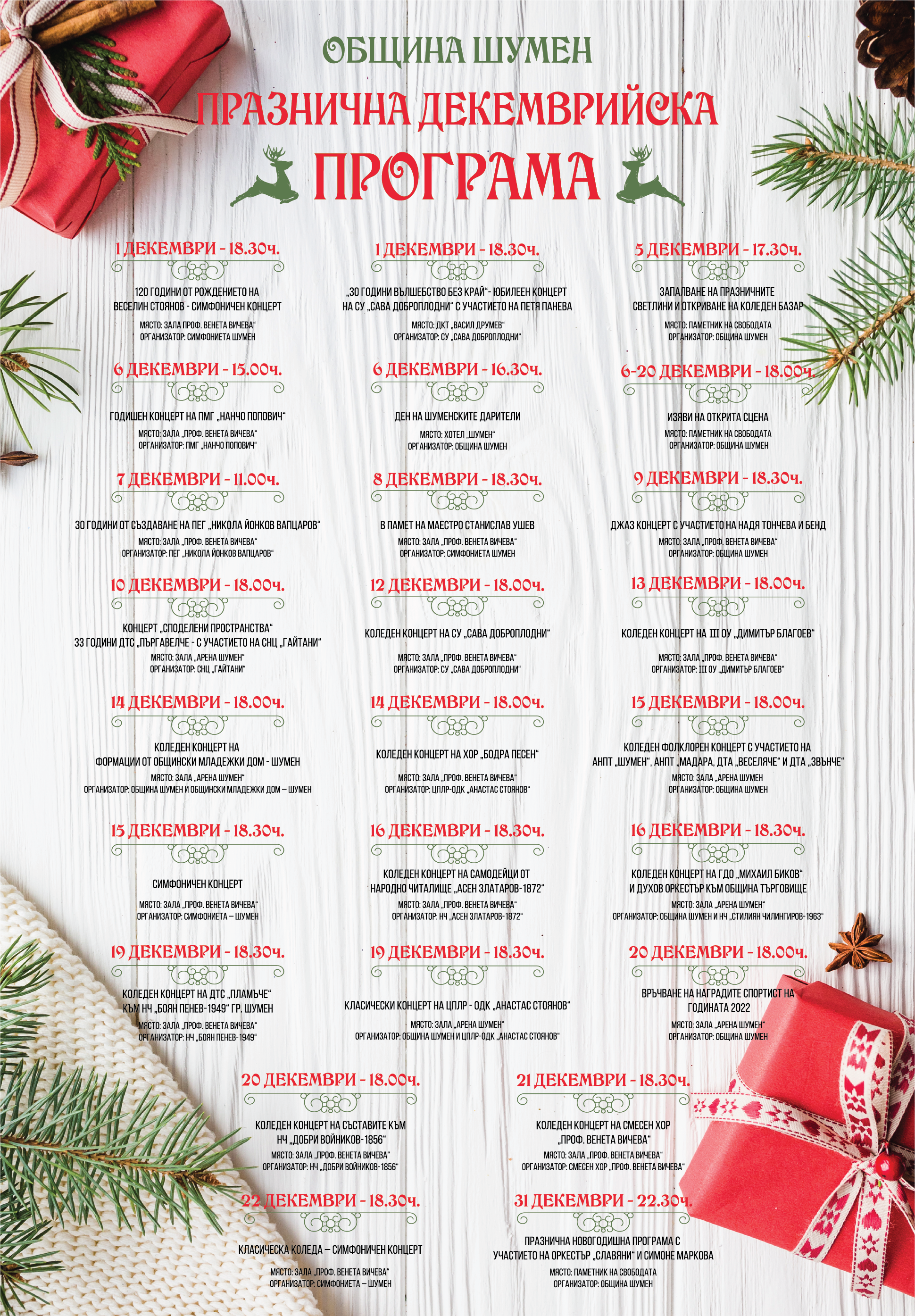 Концерти на фолклорни ансамбли, самодейни колективи, художествено-творчески формации, музикални състави и богата празнична програма ще радват жители и гости на град Шумен през месец декември. Празничният афиш на общината включва концерти на открито и закрито, множество изяви на талантливи изпълнители. На 5 декември Шумен ще грейне в коледно-новогодишна украса. Церемонията по запалването на коледните светлини и откриването на традиционния базар е от 17:30 часа в парка до Паметника на Свободата. На 6 декември с официална церемония ще бъде отбелязан Денят на дарителя. Началото на церемонията е от 16:30 в хотел “Шумен”. В дните 6-20 декември на открита сцена до Паметника на Свободата талантливи изпълнители ще радват шуменци и гости на града. С празнична новогодишна програма, с участието на оркестър “Славяни” и Симоне Маркова, Шумен ще посрещне Новата 2023 година. Началото е от 22:30 часа, мястото – парка до Паметника Свободата. Вижте какво още включва декемврийската празнична програма на Община Шумен.