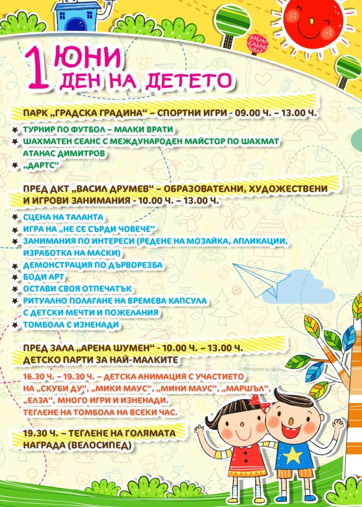 Богата празнична програма от прояви организира Община Шумен по случай Международния ден на детето. На 1 юни, сряда, в града ще бъдат обособени три центъра за спортни игри, занимания и творчески изяви за децата на Шумен. Празникът ще започне в 9.00 часа с турнир по футбол на малки врати на игрището в Градската градина. В него ще се включат ученически отбори от първи до четвърти клас от шуменските училища. По същото време по алеите на Градската градина международният майстор по шахмат Атанас Димитров ще организира сеанс на едновременна игра по шахмат с деца и младежи. По-късно младите шахматисти ще се състезават и помежду си. Ще бъдат организирани и игри по дартс.