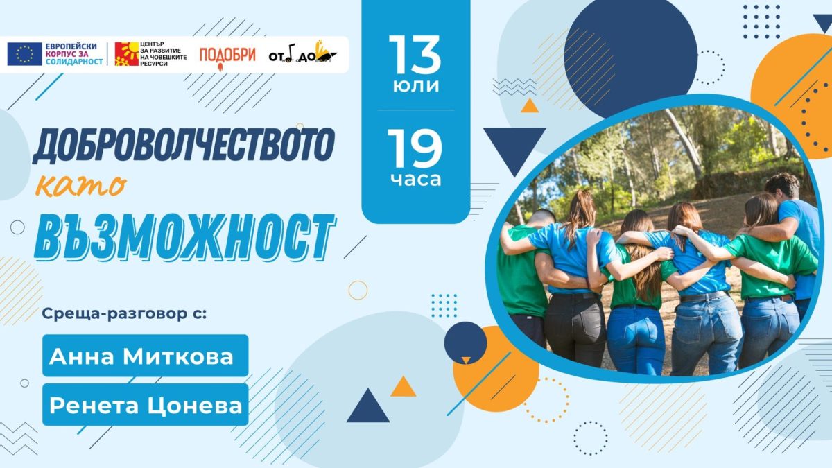 Фондация „Подобри“ организира информационна среща на тема „Доброволчеството като възможност“. Тя ще се проведе на 13 юли от 19:00 ч. в пространството за изкуство „От нота до цвят“. Събитието ще протече под формата на свободен разговор с доброволците и представителите на фондация „Подобри“. Те ще представят различни възможности, които програмата „Европейски корпус за солидарност“ предоставя на младежи и организации.