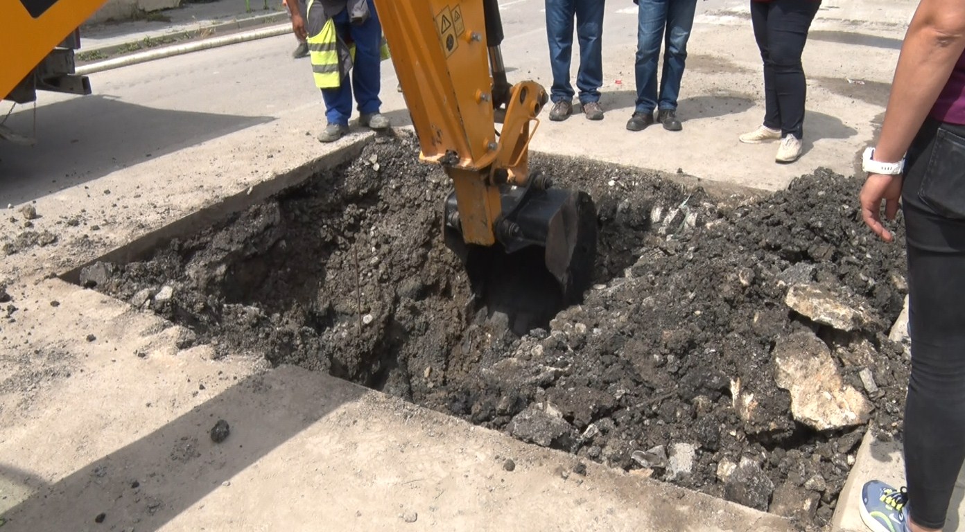 Пропадна участък на пътното платно на улица „Тича“ в Шумен. На мястото се екипи на общината и ВиК, фирмата, която извърши ремонт на улицата преди 4 години. Докато ремонтът се извършваше улицата бе затворена за движение.
