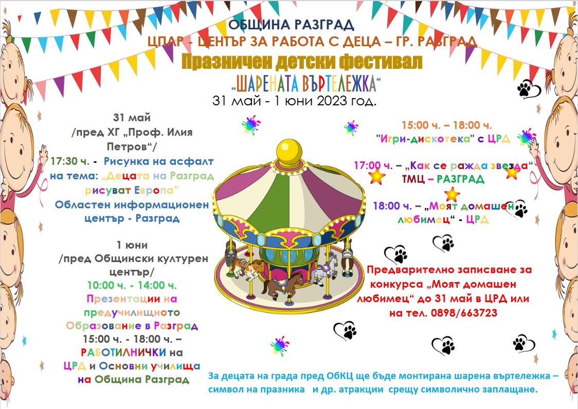 Празничният детски фестивал „Шарената въртележка” се организира съвместно с ЦПЛР Център за работа с деца и започва на 31 май с отложения на Деня на Европа заради дъждовно време конкурс за рисунка на асфалт, част от инициативата „Дни на Европа” на Областен информационен център. В 17,30 ч. в сряда пред Художествената галерия „Проф. Илия Петров” малчуганите ще рисуват на тема „Децата на Разград рисуват Европа”. Участниците в конкурса ще получат брандирани фланелки или шапки на Областен информационен център – Разград и комплект цветни тебешири. За целта е необходимо 30 минути преди началото, ръководителите на групи от училища или школи да представят на организаторите списък по образец на ОИЦ, а участниците извън групите да се запишат на място. Участниците ще бъдат разпределени в три възрастови групи: до 7 години, I-IV клас и V-VIII клас. Пособия за рисуване ще са наградите за отличените от жури малки художници във всички възрастови групи.
