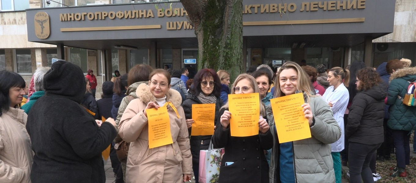 Специалистите по здравни грижи в Шумен се включиха в националния протест на колегите си. От 11 до 12 часа медицински сестри, акушерки и рехабилитатори се събраха за час пред сградата на многопрофилната болница.