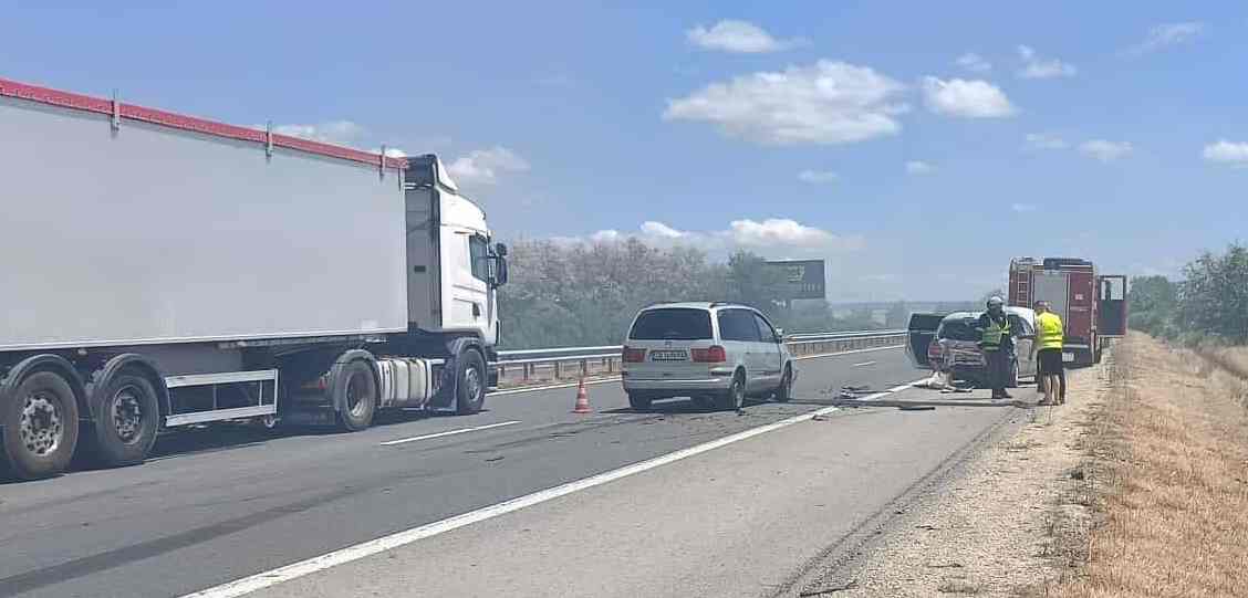 В района на 360-ти километър на аутобана в аварийната лента, посока София е пламнал лек автомобил, а в другата лента са катастрофирали два автомобила. Пламъците обхванали и част от сухите треви до предпазната мантинела.