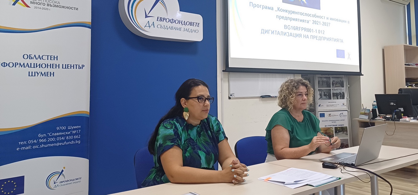 Представители на бизнеса се включиха в информационен ден по Програма „Конкурентоспособност и иновации в предприятията“. Събитието организира Областният информационен център (ОИЦ) в Шумен. Eкспертите представиха възможностите за кандидатстване по две ключови процедури, насочени към енергийната ефективност и дигиталната трансформация.