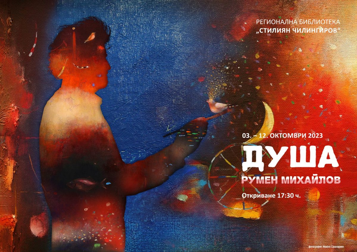 Изложба с творби на Румен Михайлов ще бъде открита на 3 октомври, в 17:30 ч. в Регионална библиотека „Стилиян Чилингиров”. Под наслов „Душа” експозицията представя картини и пластики на художника, които са част от семейната колекция и в голямата си част ще бъдат показани за първи път.