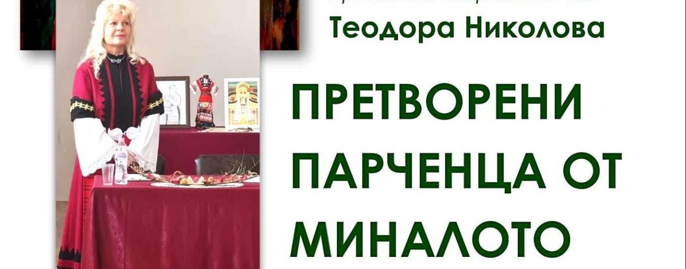 Изложба живопис и приложно творчество на Теодора Николова ще бъде открита на 10 октомври в 17:30 ч. в Регионална библиотека „Стилиян Чилингиров“. Под наслов „Претворени парченца от миналото“ експозицията представя живописни платна, изобразяващи чудния лик на българката и нейния бит, ръчно тъкани стенни пана, бродирани бижута и картички с елементи от българска шевица и флорални мотиви, художествен декупаж и възродени за нов живот предмети на бита от миналото.