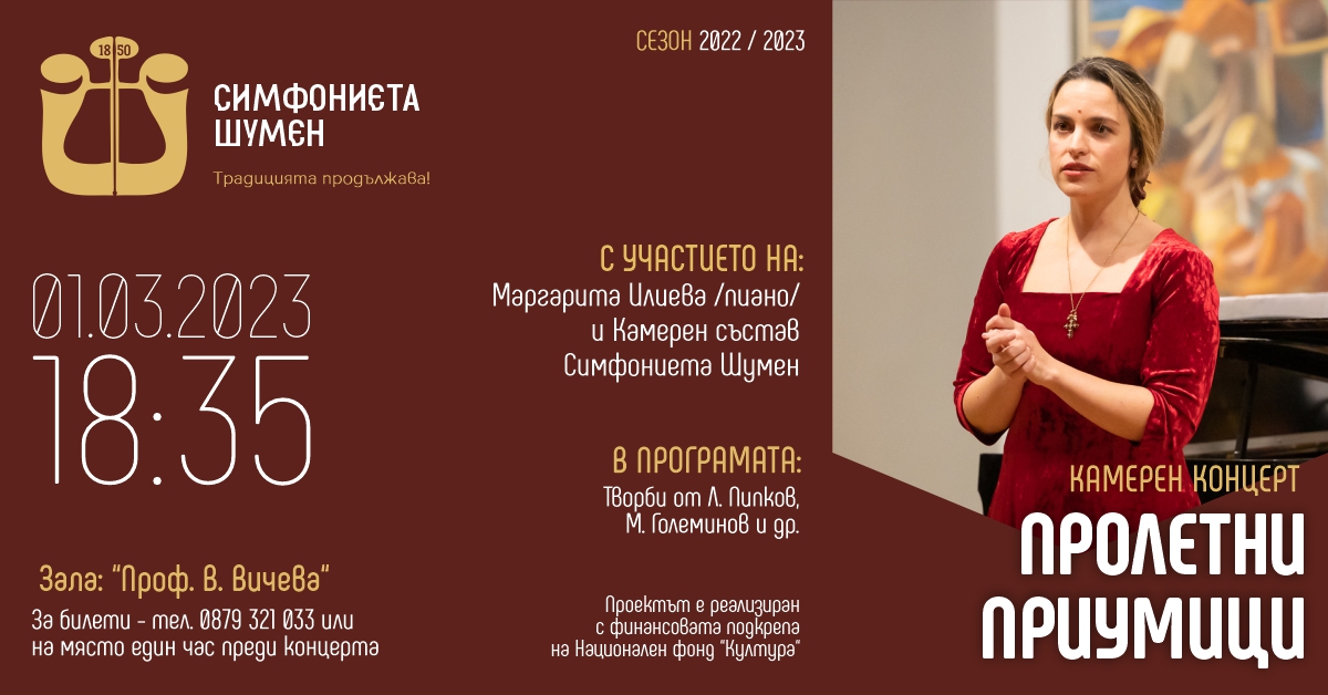 Симфониета – Шумен с първомартенски камерен концерт “Пролетни приумици”. Под диригенстската палка на маестра Калина Василева ще звучат творби на Любомир Пипков, Марин Големинов, и други известни композитори. Концертната програма, с участието на пианистката Маргарита Илиева, ще започне на 1 март от 18:35 часа в зала “Професор Венета Вичева”.