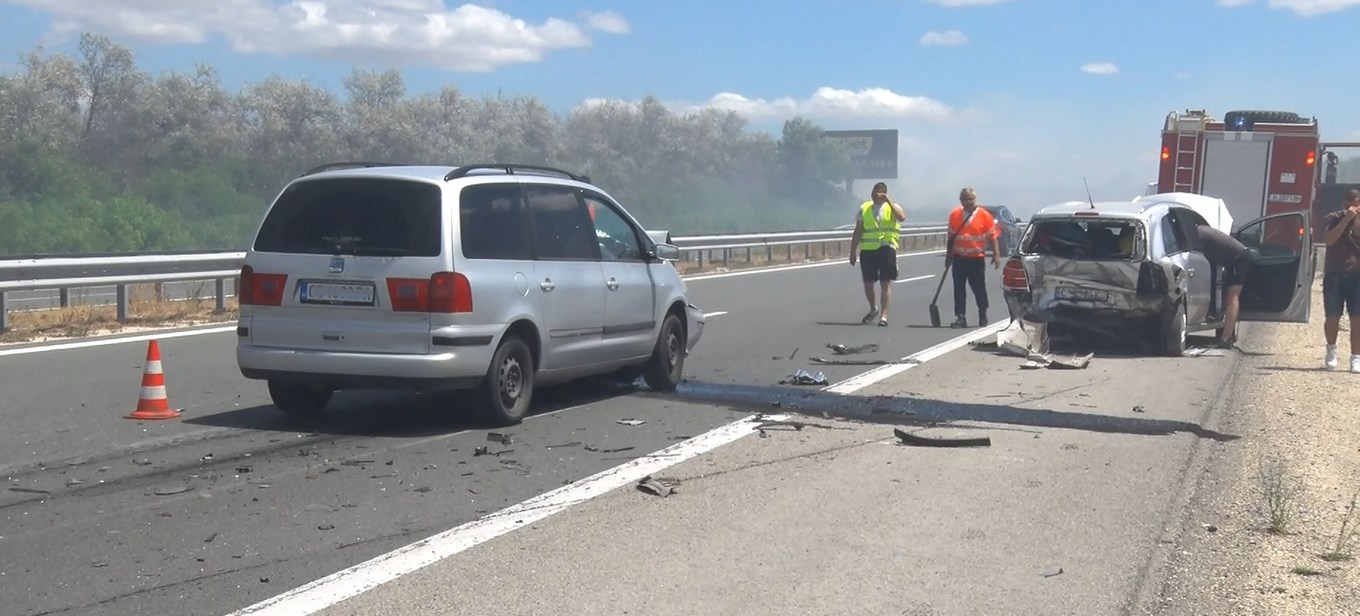 Автомобил изгоря, а други два се удариха на магистрала „Хемус“. Двата инцидента станаха един след друг в двете платна на магистралата и предизвикаха затваряне на участъка до Нови пазар. В катастрофата има и пострадали.
