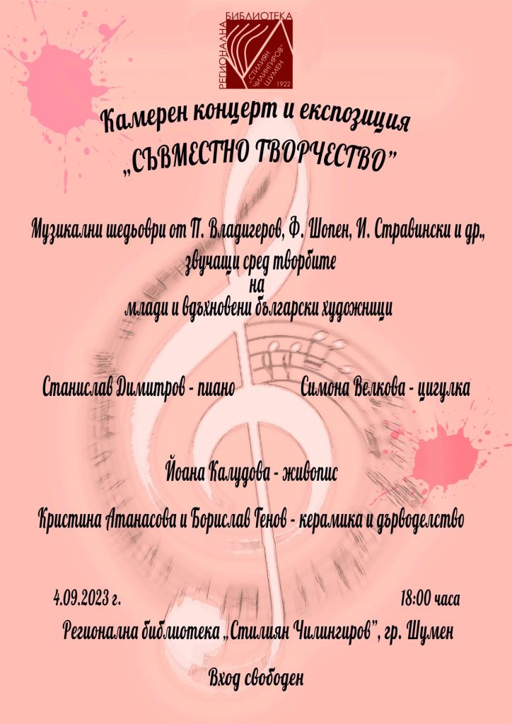 Шуменската Регионална библиотека „Стилиян Чилингиров” кани почитателите на музикалното и изобразителното изкуство на камерен концерт и експозиция „Съвместно творчество”. Събитието ще се състои на 4 септември, понеделник, от 18:00 ч.