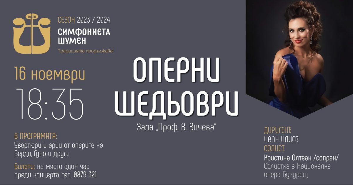 Концертът „Оперни шедьоври“ ще се състои на 16 ноември 2023 г. от 18:35 часа на сцената на зала „Проф. Венета Вичева“ в Шумен. Солист е сопраното Кристина Олтеан, солистка на Националната опера в Букурещ.