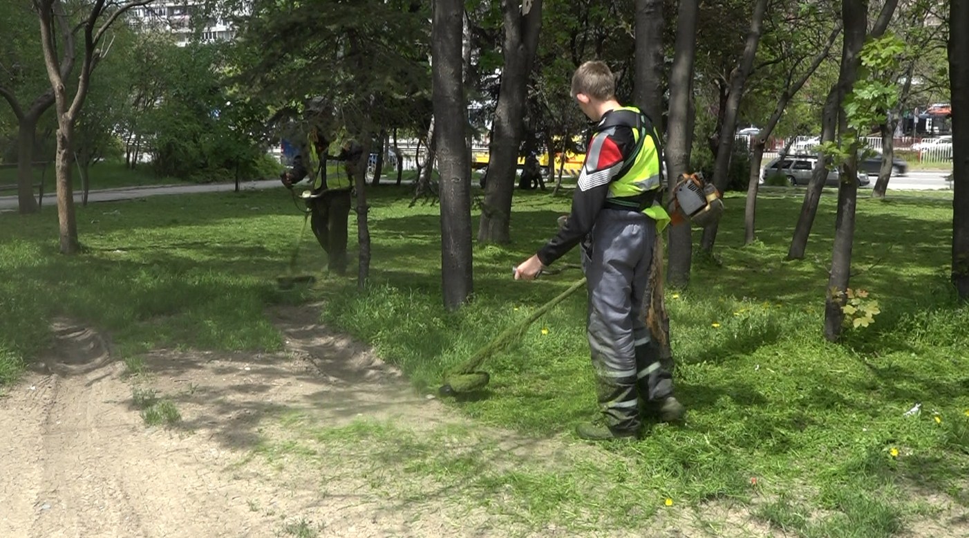 Днес се извършва косене на тревните площи и почистване на пространството между Летния театър и водната каскада.