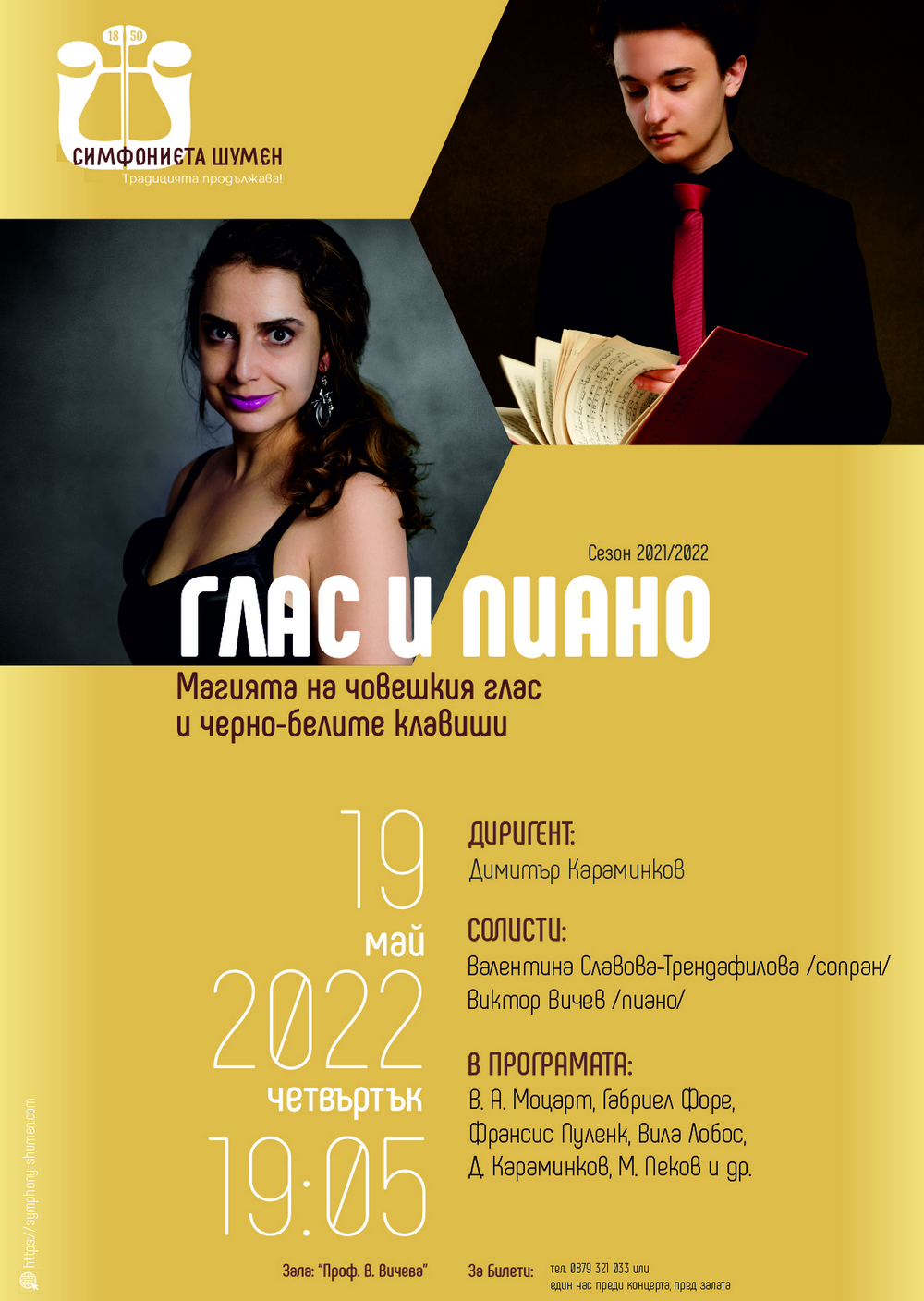 Филигранни вокални миниатюри ще озвучат залата “Проф. Венета Вичева“ по време на концерта на Симфониета – Шумен този четвъртък, 19 май. В програмата са включени творби на Франсис Пуленк и Габриел Форе. Към тази френска изтънченост се присъединяват Михаил Пеков с „Интермецо“ и Маестро Димитър Караминков, който ще издирижира своите “Три миниатюри за сопран и оркестър” в изпълнение на сопраното Валентина Славова-Трендафилова. Младия пианист Виктор Вичев ще поднесе на публиката “Концерт за пиано и оркестър № 23” от Моцарт.
