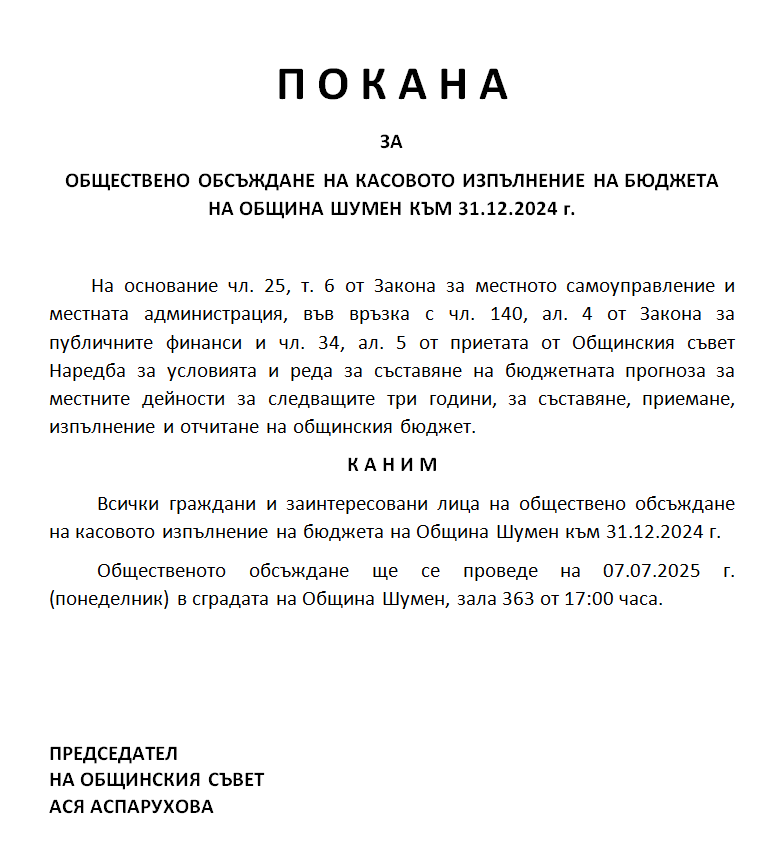 Обществено обсъждане на касовото изпълнение на бюджета на Община Шумен към 31 декември 2024 г. ще се проведе в понеделник (7 юли) от 17:00 часа в зала 363 в сградата на Общината. Поканата е отправена към всички граждани и заинтересовани лица от името на председателя на Общинския съвет.
