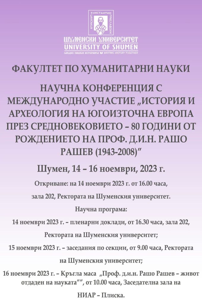 Факултетът по хуманитарни науки и Катедрата по история и археология към Шуменският университет „Епископ Константин Преславски“ организират научна конференция с международно участие „История и археология на Югоизточна Европа през Средновековието – 80 години от рождението на проф. д.и.н. Рашо Рашев (1943-2008)“.