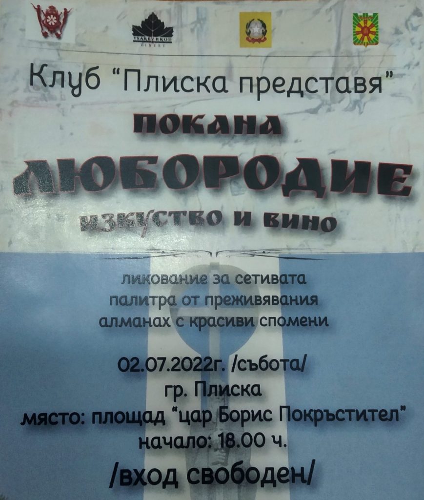 Празник на площада в първопрестолна Плиска ще обедини историята, изкуството и любовта към виното. Мотото е „Любородие”, а организатори – група съмишленици от клуб „Плиска представя”. Началото на празничната вечер, с творчески изяви, дегустации и художествена изложба, е от 18 часа в събота (2 юли), каза за пресконференция председателят на клуб „Плиска представя” Михаил Никитин.