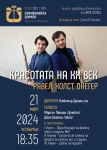 Двамата изтъкнати инструменталисти от новата музикална генерация ще поднесат на публиката Фуга-концерт за флейта, обой и струнни от английския композитор Густав Холст и Камерен концерт за флейта, английски рог и струнни от швейцарския композитор Артур Онегер. Във втората част на концерта публиката ще се наслади на едно много специално изпълнение на „Гробът на Купрен“ от френския автор Морис Равел. Произведението е написано в памет на бароковия композитор Франсоа Купрен, оригинално за пиано, а по-късно оркестрирано от самия Равел и превърнато в един малък шедьовър от изящни танци. Соло обой в сюитата на Равел ще изпълни Павел Пенев, друг млад и талантлив музикант, който наскоро стана част от оркестъра на Симфониета – Шумен. Концертът „Красотата на ХХ век“ започва в 18:35 часа в зала „Проф. Венета Вичева“.